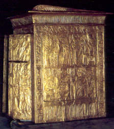 seine Todesursache ist nichts näheres bekannt. Statuenschrein des Tutanchamun, 18.Dynastie um 1325 v. Chr., Theben-West, Tal der Könige, Holz und Silber vergoldet, Höhe 50,5 cm.