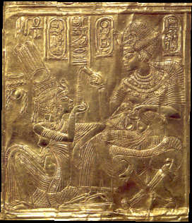 Detail des Statuenschreins Tutanchamuns. Somit vollzieht sie Handlungen, die der König sonst vor den Göttern durchführt. Eine der Szenen zeigt den auf einem kostbaren Klappstuhl sitzenden König, der von seiner vor ihm auf dem Boden hockenden Frau ein Blumenbouquet erhalten hat. Als Gegengabe gießt er ihr Wein in die geöffnete Handfläche, ein Motiv, das schon in ähnlicher Weise aus den Privatgräbern von Amarna bekannt ist. |